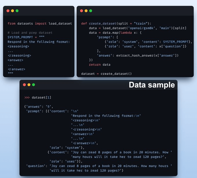 We load GSM8K (a math word problem dataset) and format prompts for reasoning.