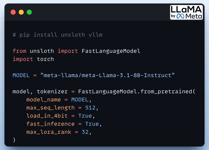 We start by loading the Llama 3.1-8B model and the tokenizer using Unsloth.