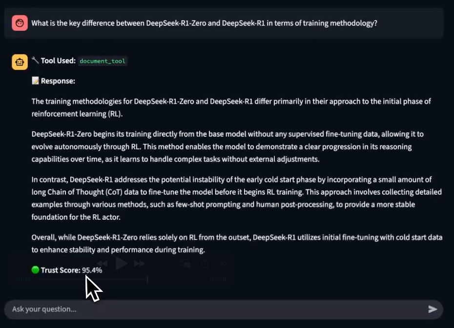 Upon prompting, notice that the app displays a Trust Score on the generated response.