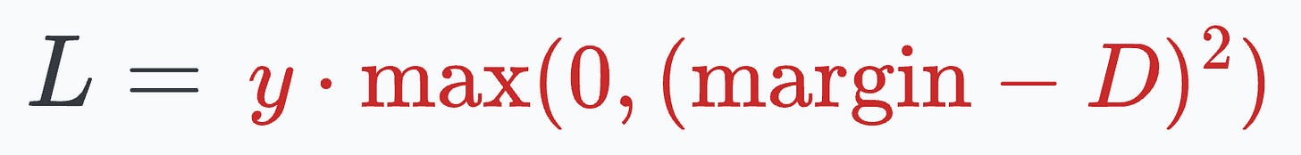 y is the true label.D is the distance between two embeddings.margin is a hyperparameter, typically greater than 1.Here’s how this particular loss function helps: