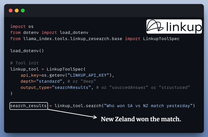 To equip our system with web search capabilities, we will use Linkup's state-of-the-art deep web search features. It also offers seamless integration with LlamaIndex.
