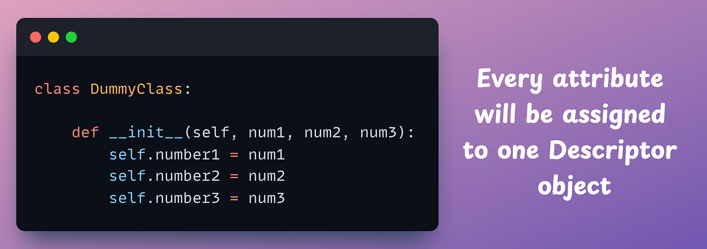 __set__ method is called when the attribute is assigned a new value. We can define all custom checks here.__set_name__ method is called when the descriptor object is assigned to a class attribute. It allows the descriptor to keep track of the name of the attribute it’s assigned to within the class.__get__ method is called when the attribute is accessed.If it’s unclear, let me give you a demonstration.