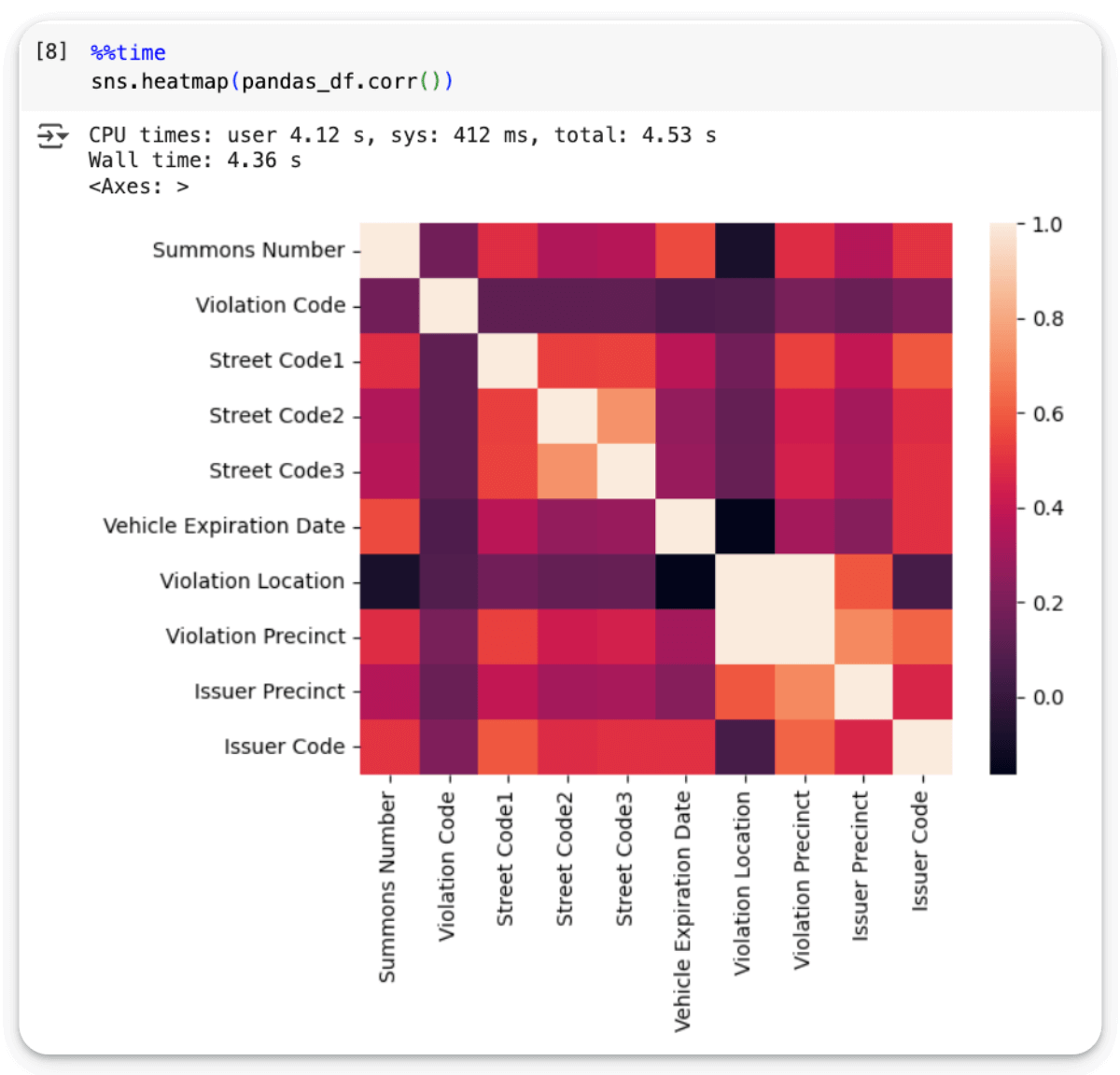 Creating a correlation heatmap on the Pandas DataFrame takes 4.36 seconds: