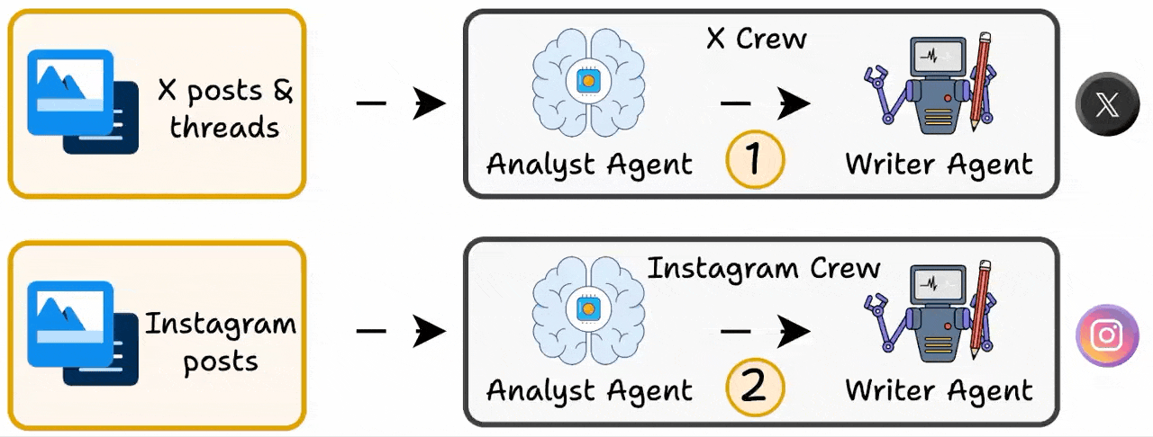 We will have multiple Crews, one for each platform (X, Instagram, YouTube, etc.)
