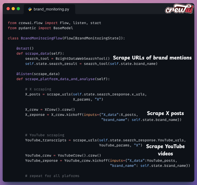 To monitor a brand, we must scrape data across various sourcesβX, YouTube, Instagram, websites, etc.