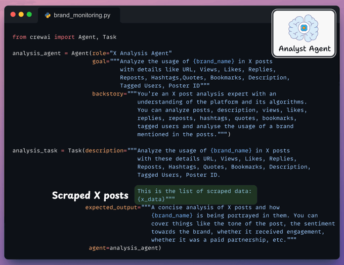 This Agent analyzes the posts scraped by Bright Data and extracts key insights. It is also assigned a task to do so.