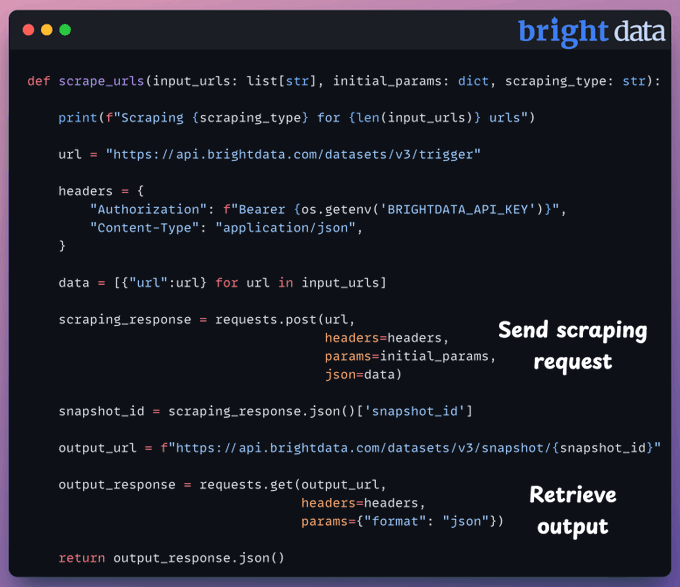 To scrape those sources, we use Bright Data's platform-specific scrapers.