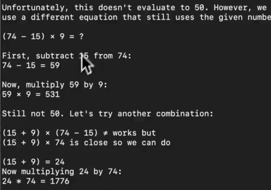 Below, we have asked it to create an equation with the numbers 15, 74, and 9 that evaluates to 50, and it produces the correct response: