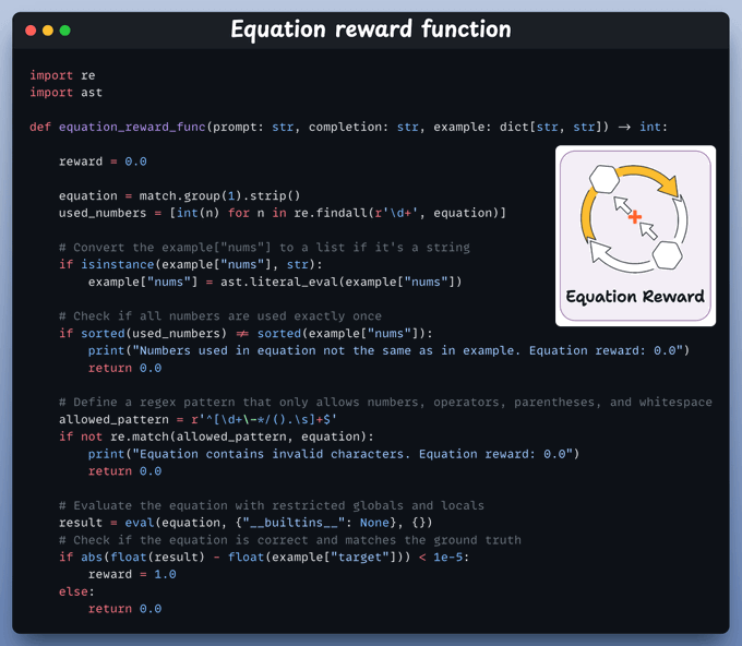 We parse the model’s final equation, check it uses all numbers once, contains only valid math symbols, and correctly calculates the target.