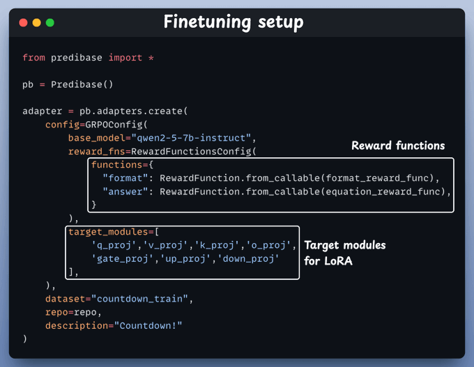 We set up a GRPO-based fine-tuning job with two reward functions—one checks the format, and the other verifies the math.