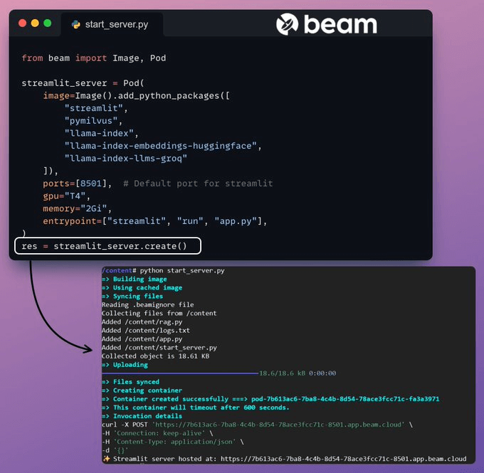Beam launches the container and deploys our streamlit app as an HTTPS server that can be easily accessed from a web browser.