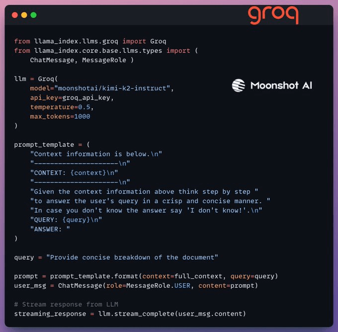 Finally, we build a generation pipeline using the Kimi-K2 instruct model, served on the fastest AI inference by Groq.
