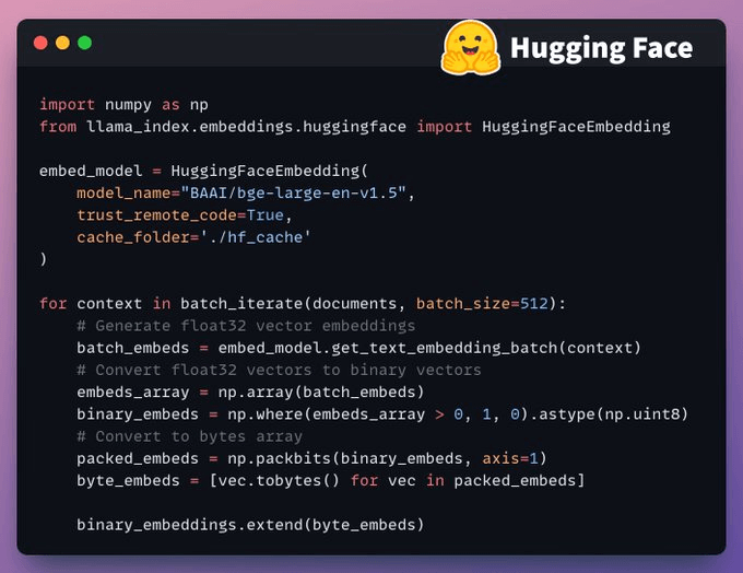 Next, we generate text embeddings (in float32) and convert them to binary vectors, resulting in a 32x reduction in memory and storage.