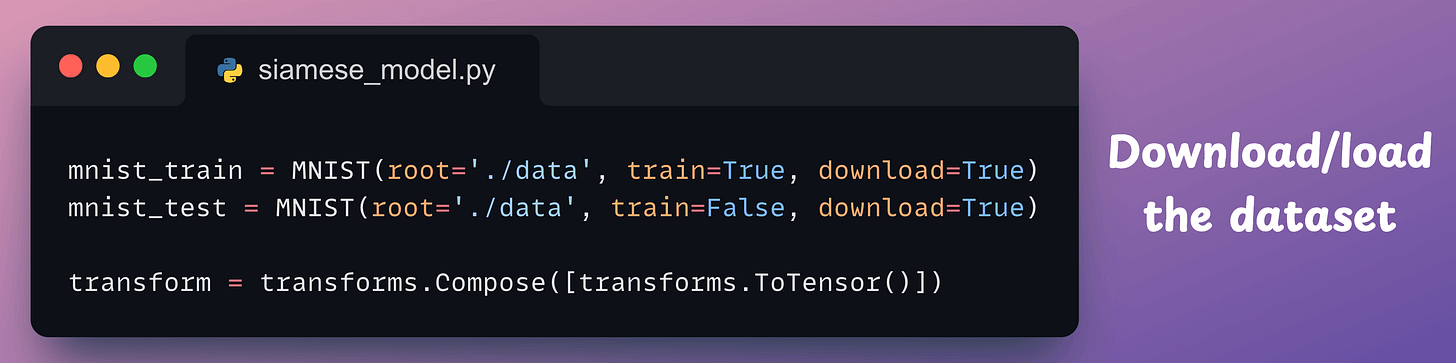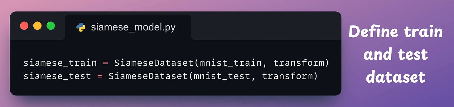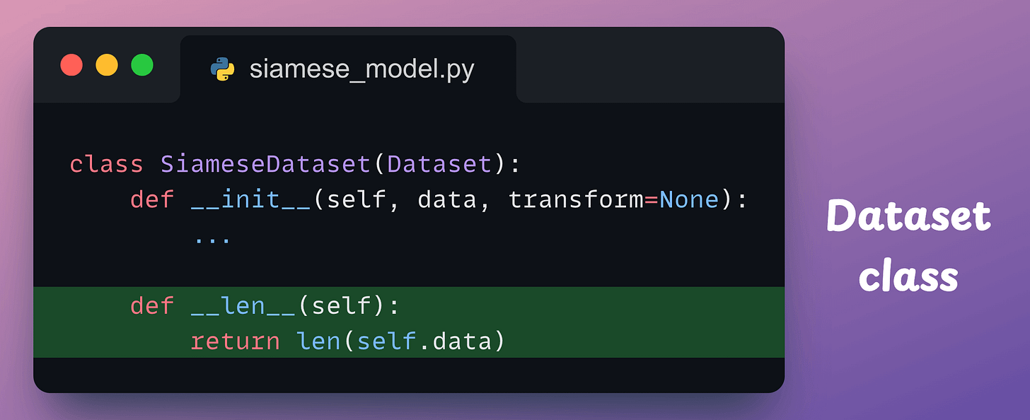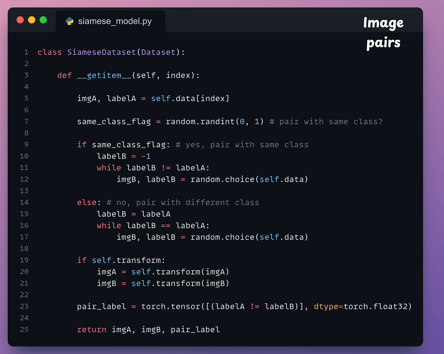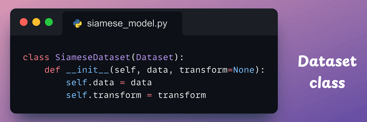 To do this, we define a SiameseDataset class that inherits from the Dataset class of PyTorch: