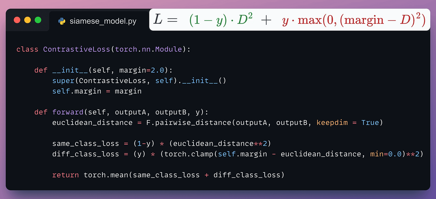 y is the true label.D is the distance between two embeddings.margin is a hyperparameter, typically greater than 1.Next, let’s look at the implementation of this model.