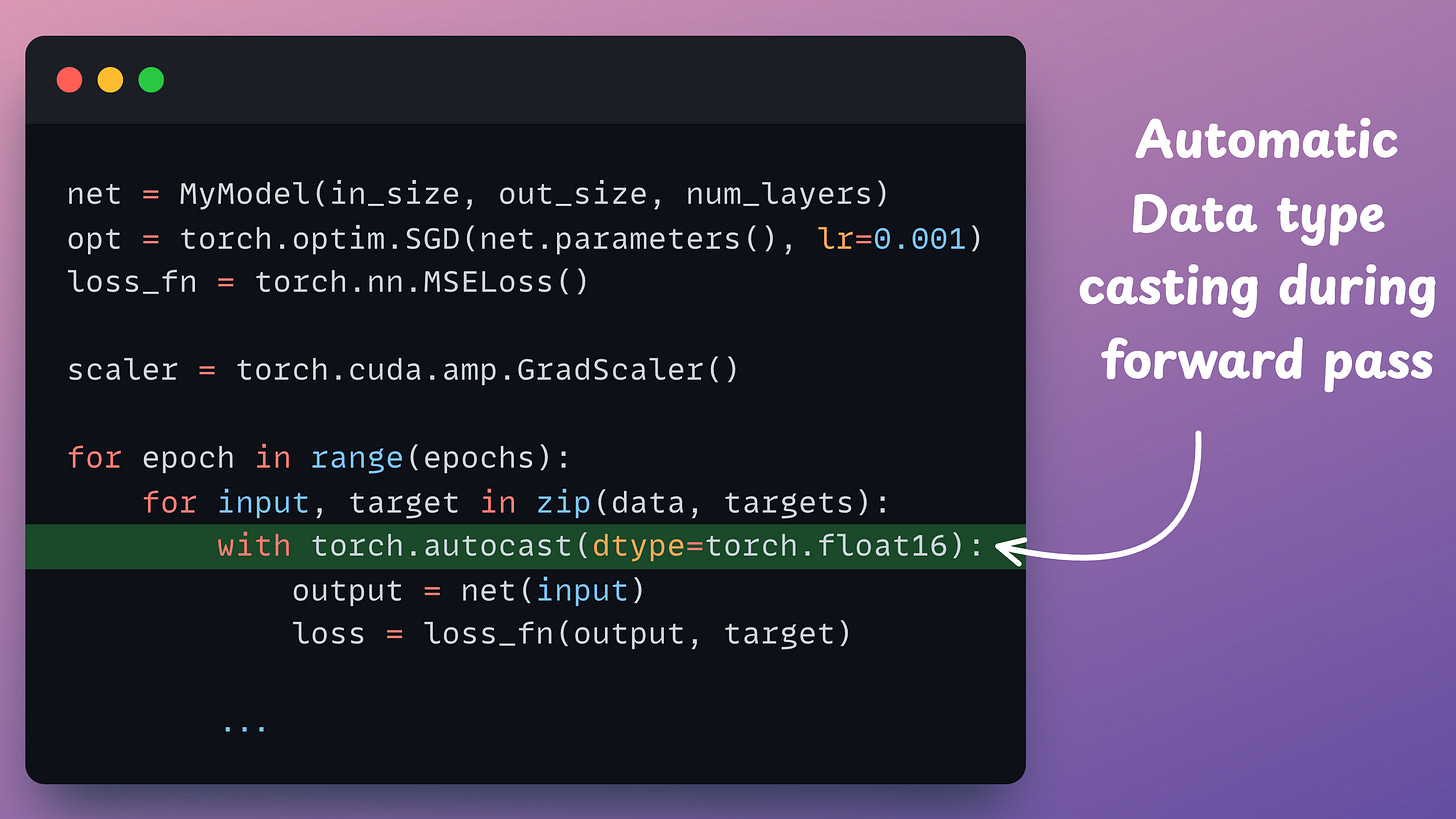 float16 copy of weights during the forward pass.float32 and scale it to have more precision in gradients, which works in float16.float16 can provide additional speedup.float16, the heavy matrix multiplication operations have been completed. Now, all we need to do is update the original weight matrix, which is in float32.float32 copy of the above gradients, remove the scale we applied in Step 2, and update the float32 weights.The mixed-precision settings in the forward pass are carried out by the torch.autocast() context manager: