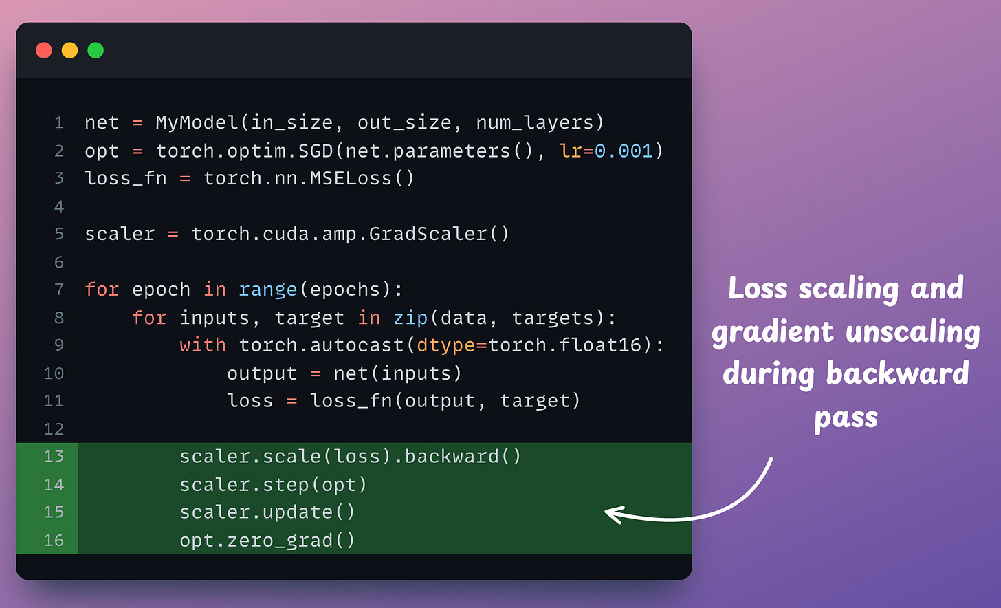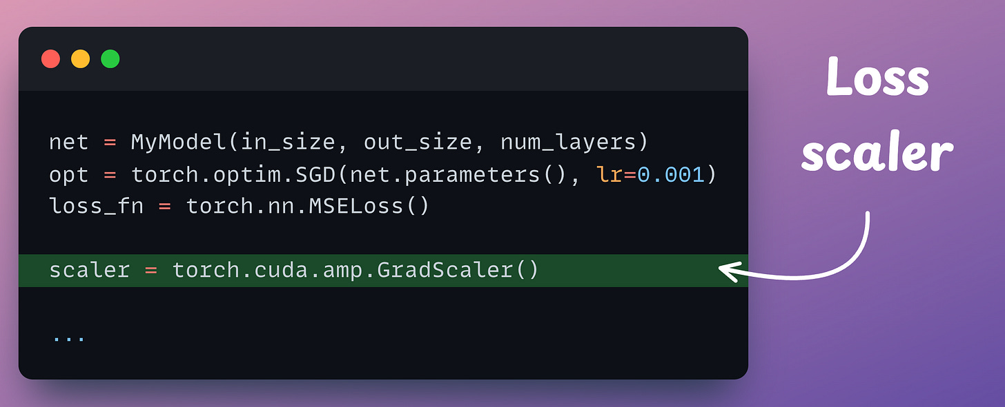 scaler.scale(loss).backward(): The scaler object scales the loss value and backward() is called to compute the gradients.scaler.step(opt): Unscale gradients and update weights.scaler.update(): Update the scale for the next iteration.opt.zero_grad(): Zero gradients.Done!