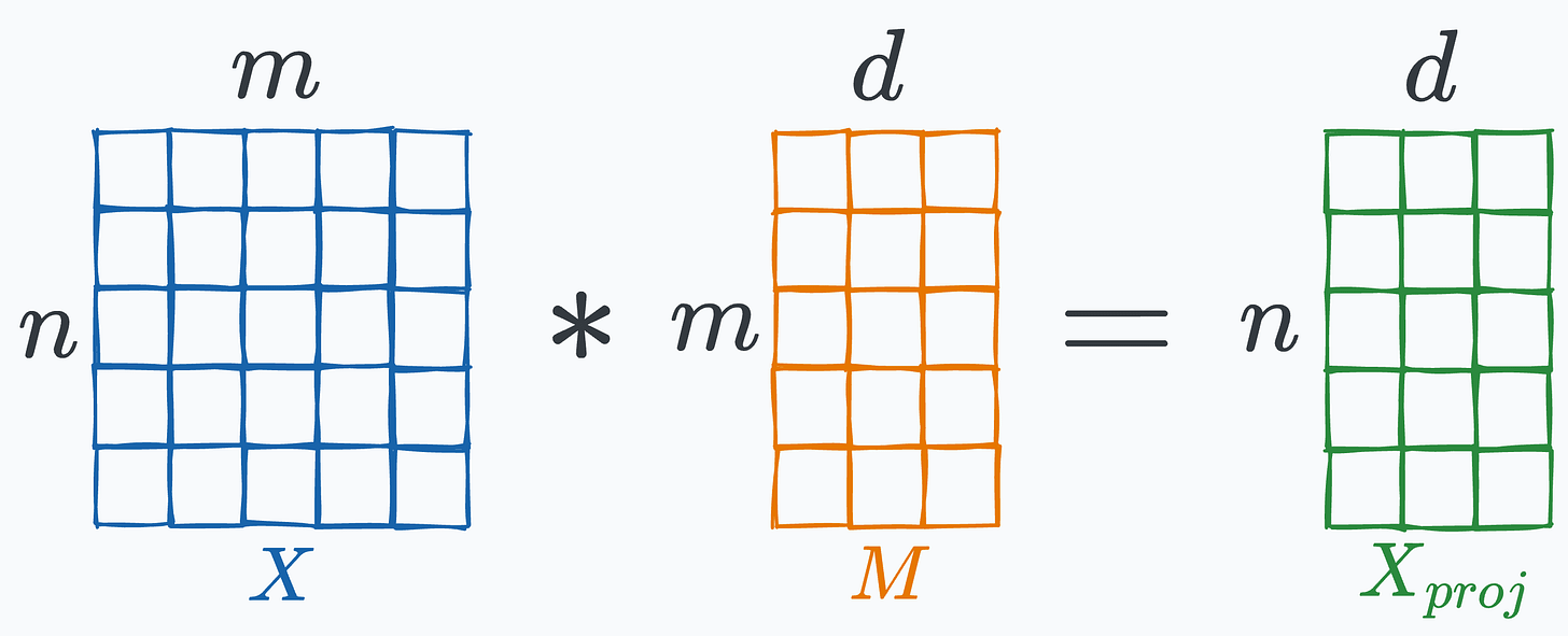 Now imagine multiplying the above high-dimensional matrix X with a random projection matrix M of shape (m, d), which results in the projected matrix: