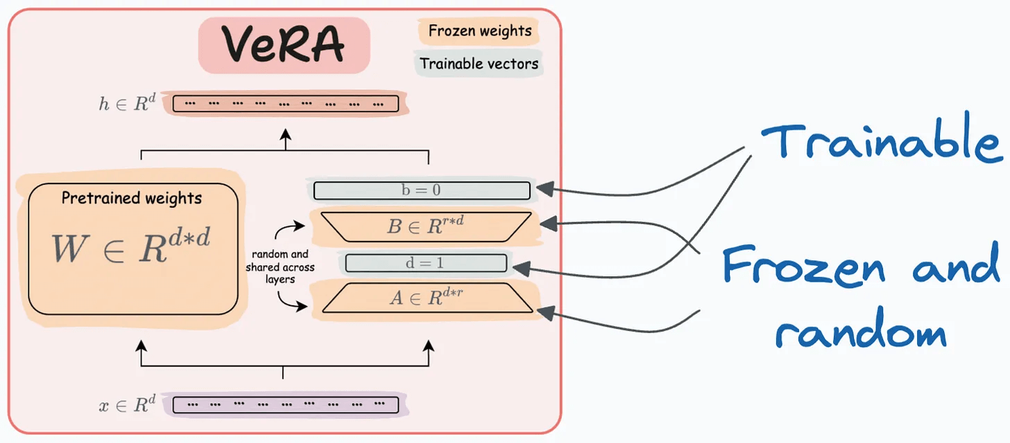 In VeRA, however, matrices A and B are frozen, random, and shared across all model layers. VeRA focuses on learning small, layer-specific scaling vectors, denoted as b and d, which are the only trainable parameters in this setup.