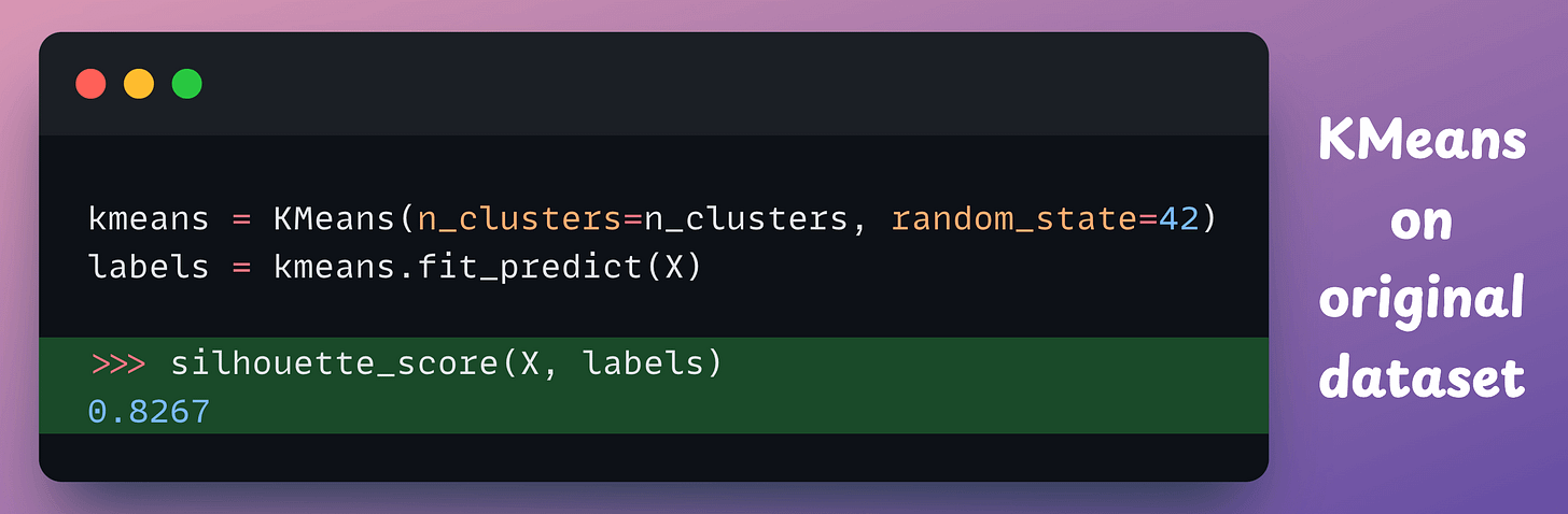 So let’s utilize KMeans on both the high-dimensional original data and the projected data, and measure the clustering quality using silhouette score.