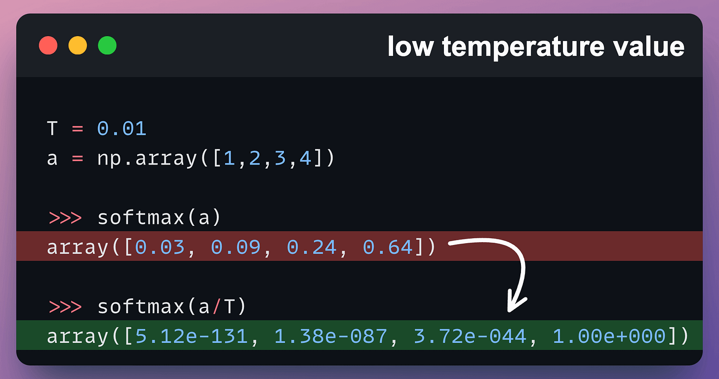 1) If the temperature is low, the probabilities look more like a max value instead of a “soft-max” value.