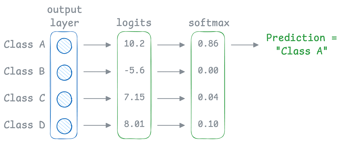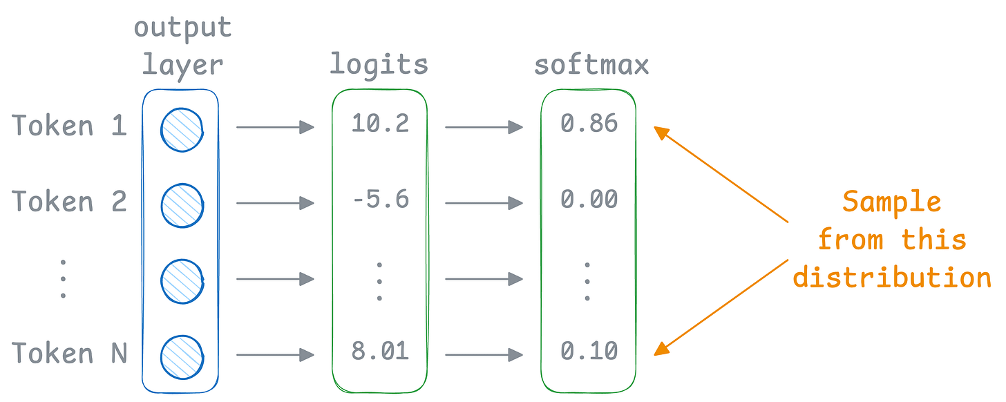 Traditional classification models use softmax to generate the final prediction from logits over all classes. In LLMs, the output layer spans the entire vocabulary.