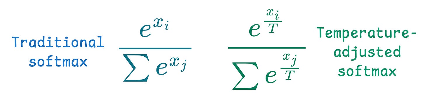 Temperature introduces the following tweak in the softmax function, which, in turn, influences the sampling process: