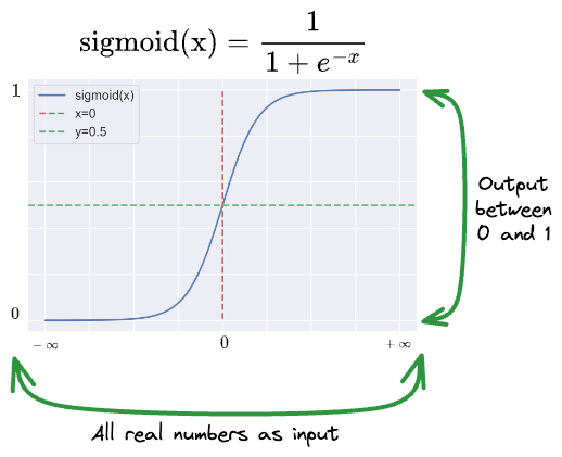 The sigmoid function maps any real-valued number $x \in \mathbb{R}$ to a value between $0$ and $1$. This ensures that output falls within a valid probability range.